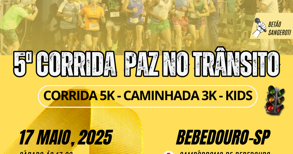 A 5ª Corrida Paz no Trânsito será realizada no dia 17 de maio de 2025 , na cidade de Bebedouro-SP, com realização do Departamento Municipal de Trânsito e organização da Brans Eventos.